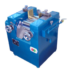 該設備由三個輥筒組成,裝在一個機架上,由電機直接帶動。一般輥筒間的轉(zhuǎn)動方向不同,前輥向前轉(zhuǎn)動,中輥向后轉(zhuǎn)動。輥子轉(zhuǎn)速前輥快、后輥慢。中間輥固定,前后兩輥裝在滑道上,有彈簧裝置,用手輪調(diào)節(jié)前后輥與中輥的距離。物料由后輥與中輥之間進入,受到輥筒的擠壓,產(chǎn)品顆粒變細,然后由快輥帶出,快輥末端裝有刮刀,使物料與輥筒分離,落入收集桶內(nèi)。由于研磨過程產(chǎn)生大量熱量,各輥筒的中心是設計為空心結(jié)構(gòu),通水冷卻,保證產(chǎn)品質(zhì)量。